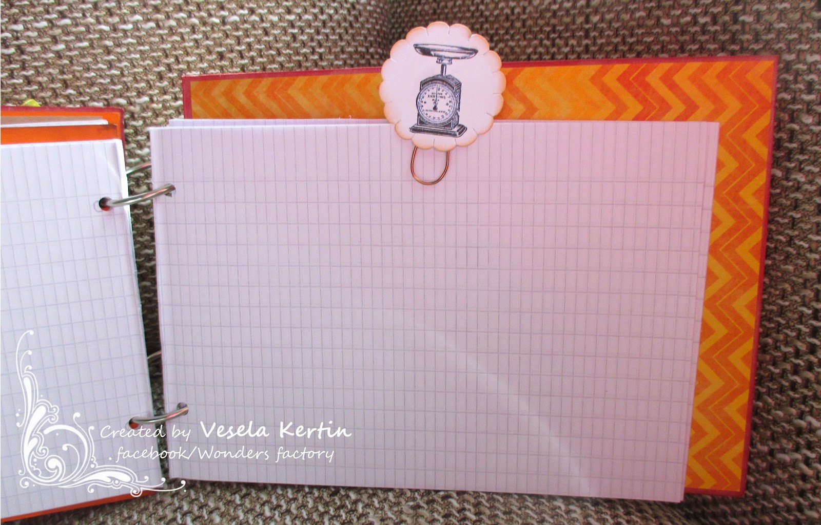 Днес ще ви покажа рецептурника, който направих за Тони( TokBobok ). Рецептурникът е с размер А5. Има 5 разделения - супи, салати, ястия, десерти и тестени изделия).Съдържа общо 125 листа, по 25 във всеки раздел. Корицата украсих с розички, висулки от полимерна глина и една телена бъркалчица, с които съм много горда защото си ги направих сама( без розите ). На гърба на корицата има мерни едици за някои продукти - по колко грама от тях има в ч.л., с.л. и чаена чаша. Отзад на всеки раздел направих по един плик за допълнителни изрезки рецепти - от някое списание или вестник. Към тях има и нещо като разделител - например до къде сте стигнали с рецептите.